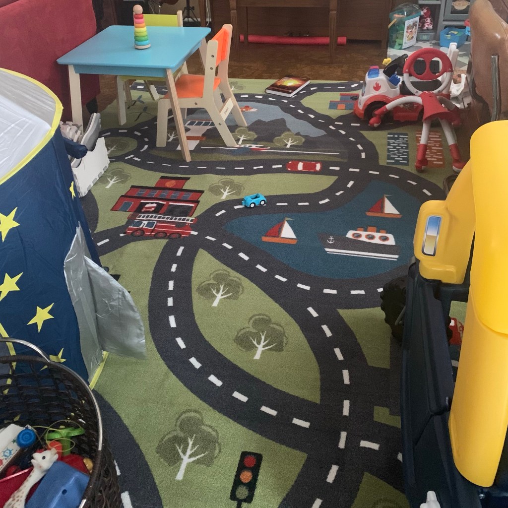 Our living room is basically two rooms in one, but it’s kind of like 1/3 room, then 1 whole room, then 2/3 room. The space we have for his toys is not quite large enough and kind of awkward. It also doubles as Dada’s office, even though Jerald mostly works in the dining room. Jordan doesn’t spend much time there, and I want that to change now that we won’t be able to take him outside for a change of scenery as often. I didn’t take a “before” photo, but here’s the after: