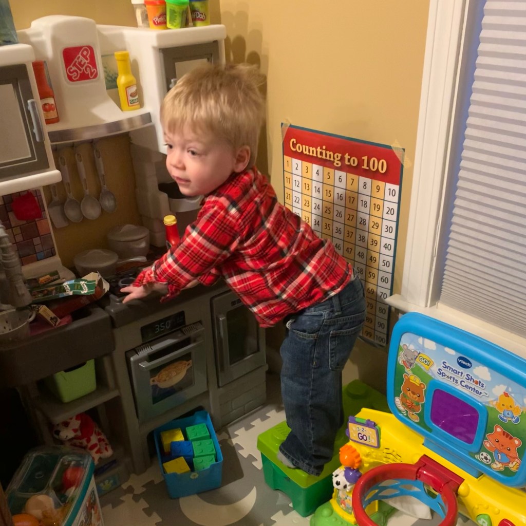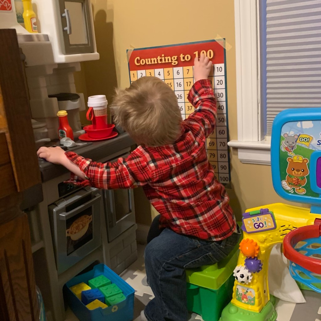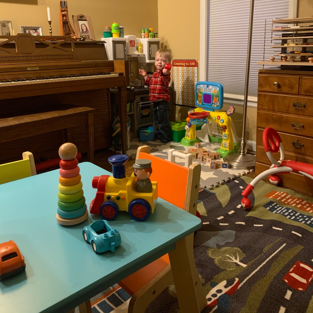 This project has kept me occupied for several weeks of Googling and Pinteresting, comparison shopping and repeatedly bugging Jerald for his opinion. I’m pretty happy with how it turned out. I could have waited for Christmas, but I want Jordan to use it now. He has been doing an incredible job of keeping himself entertained while Mommy and Dada have to work, but I still feel awful that he doesn’t go to daycare anymore. (COVID finally caught up with his old center, though, so I do feel justified that we were cautious and kept him home.)