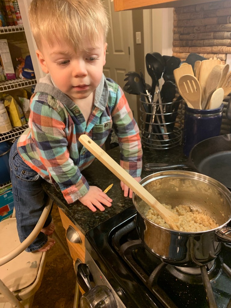 Jordan’s perch in the second photo is not quite as precarious as it looks. It was either this or I had to hold him and dinner would never be finished.
