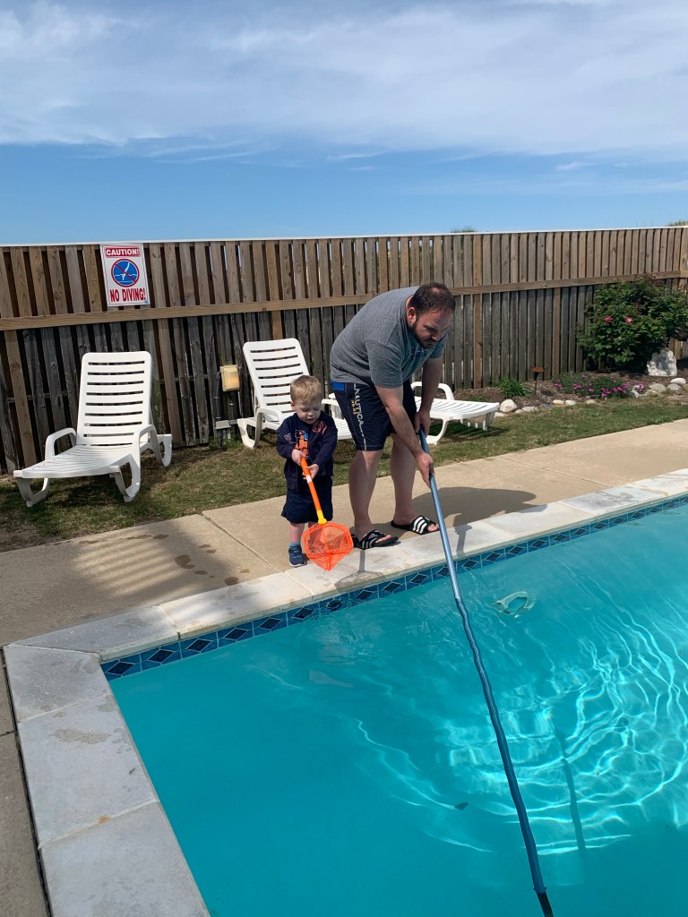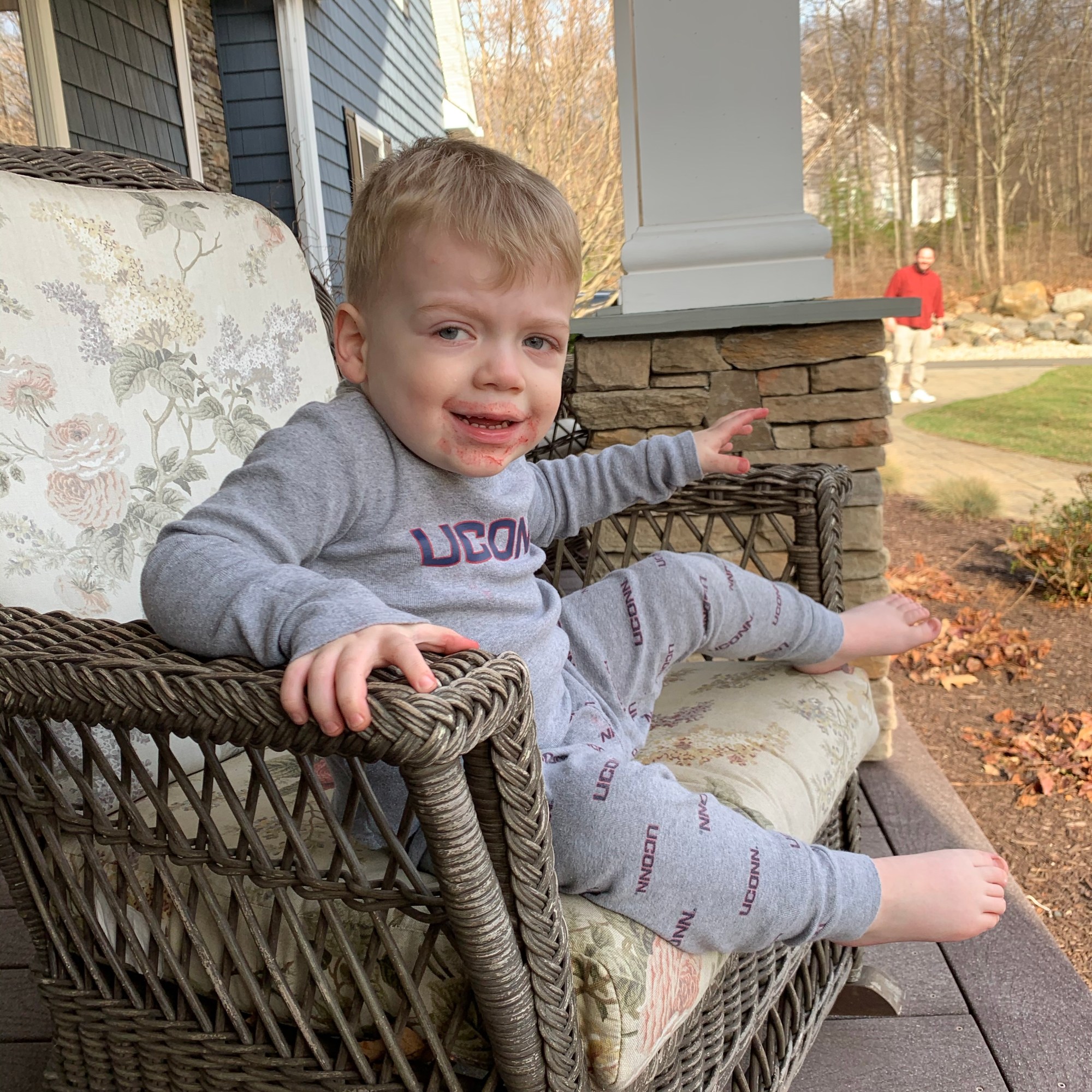 Finally, Jordan tested the strength of his aunties’ pool cover. It held, thank goodness! And he got to wear his cousin’s UConn PJs and eat strawberries afterwards, so it was all good.